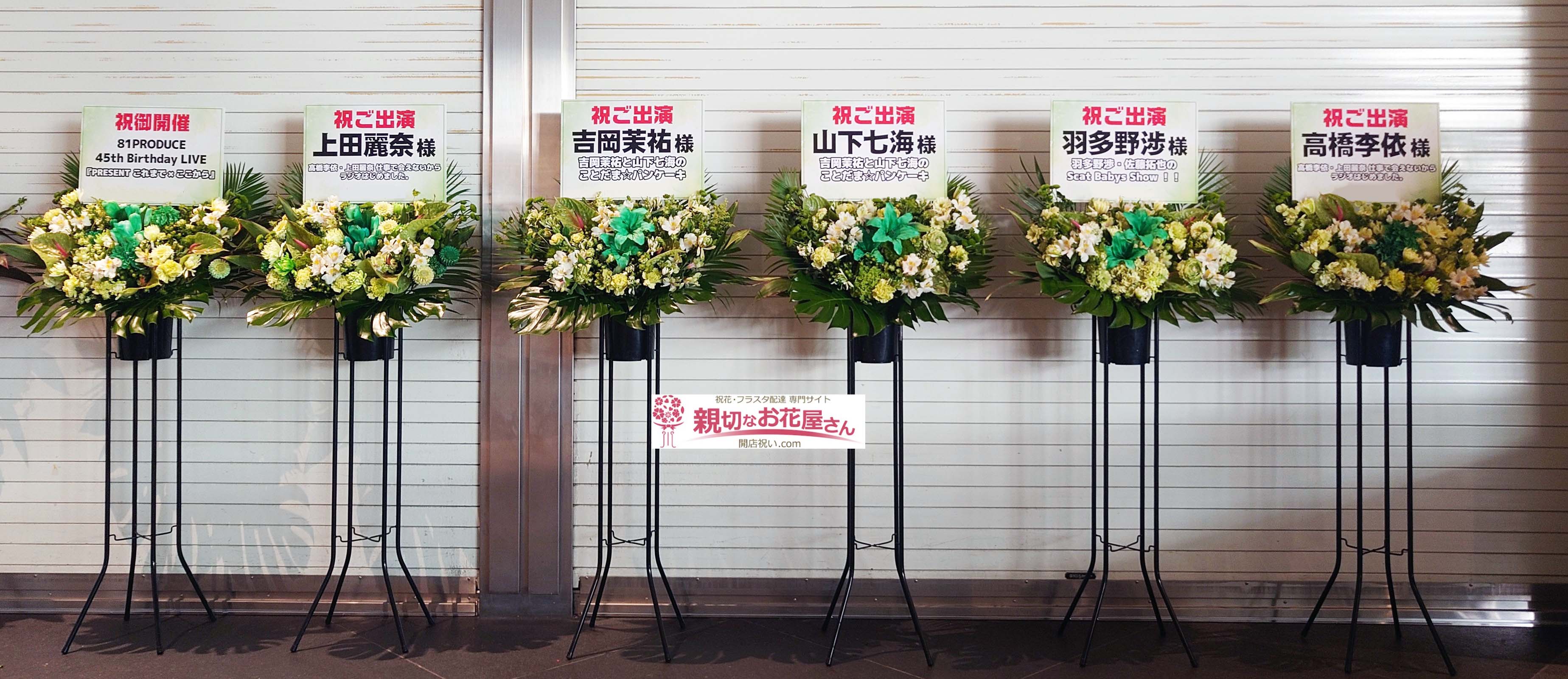 上田麗奈様 吉岡茉祐様 山下七海様 羽多野渉様 高橋李依様 会場お届け 81PRODUCE 45th Birthday LIVE 『PRESENT これまで×ここから』東京国際フォーラム(千代田区)出演祝い花・開催祝い花(おまとめ一括複数基・スタンド花6基)【生花×造花】