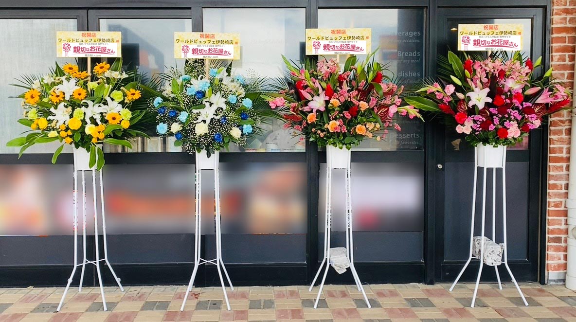 - 群馬県伊勢崎市 ワールドビュッフェ伊勢崎店 様に開店祝い花(スタンド花・4基)をお届けいたしました。黄色系1基、寒色系1基、ピンク・赤系2基、各色味で開店のお祝いにふさわしい華やかなスタンド花をお作りしました。群馬県伊勢崎市のお祝い花(アレンジメント花・スタンド花・フラスタ・胡蝶蘭・観葉植物)の手配は親切なお花屋さん(開店祝い.com)にお任せ下さい!
