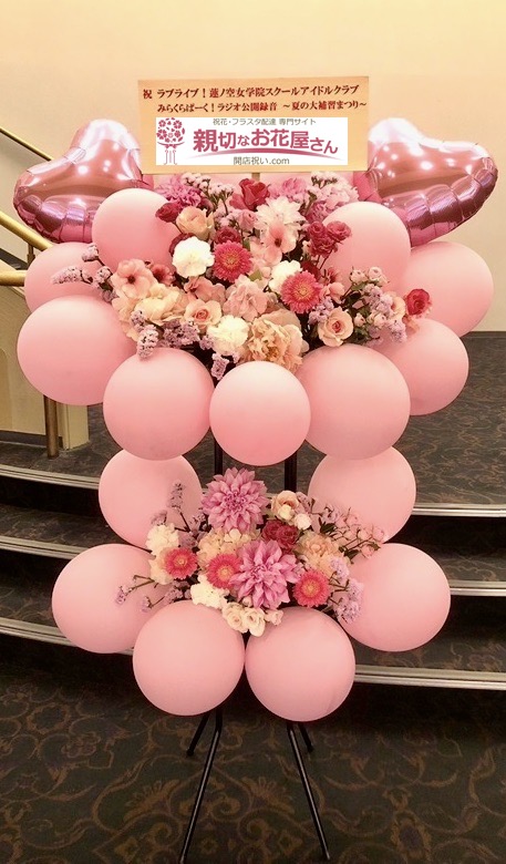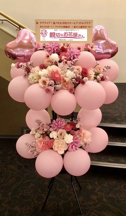 - 【造花×生花】東京都千代田区有楽町 ヒューリックホール東京 『ラブライブ!蓮ノ空女学院スクールアイドルクラブ みらくらぱーく!ラジオ公開録音 ~夏の大補習まつり~』会場に祝花(フラスタ・2基)をお届けしました。淡いピンクの色合いでおまとめしました。東京都千代田区有楽町のお祝い花(アレンジメント花・スタンド花・フラスタ・胡蝶蘭・観葉植物)の手配は親切なお花屋さん(開店祝い.com)にお任せください!