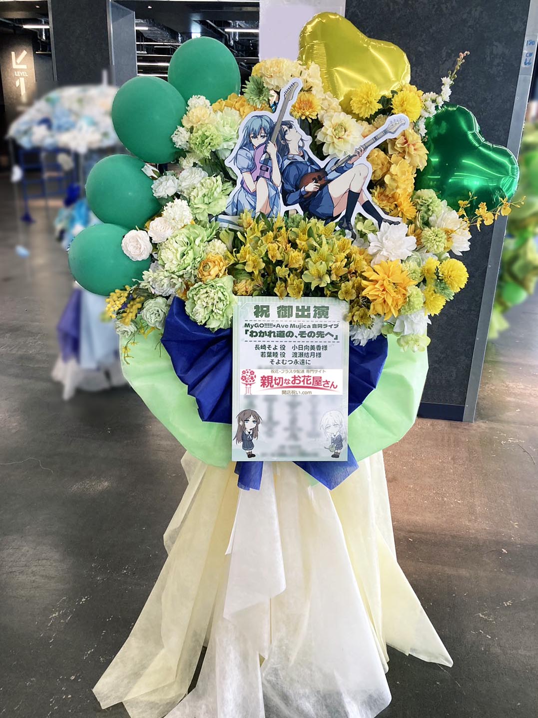 - 【生花×造花】神奈川県横浜市西区 Kアリーナ横浜『MyGO!!!!! × Ave Mujica 合同ライブ「わかれ道の、その先へ」』A長崎そよ役 小日向美香様 若葉睦役 渡瀬結月様に出演祝い花(フラスタ)をお届けしました。黄・黄緑・白の三色の花材をミックスしておまとめしました。二色を重ねたリボンやフリル風スカートの装飾などが華やかなフラスタとなっております。神奈川県横浜市西区のお祝い花(アレンジメント花・スタンド花・フラスタ・胡蝶蘭・観葉植物)の手配は親切なお花屋さん(開店祝い.com)にお任せください!