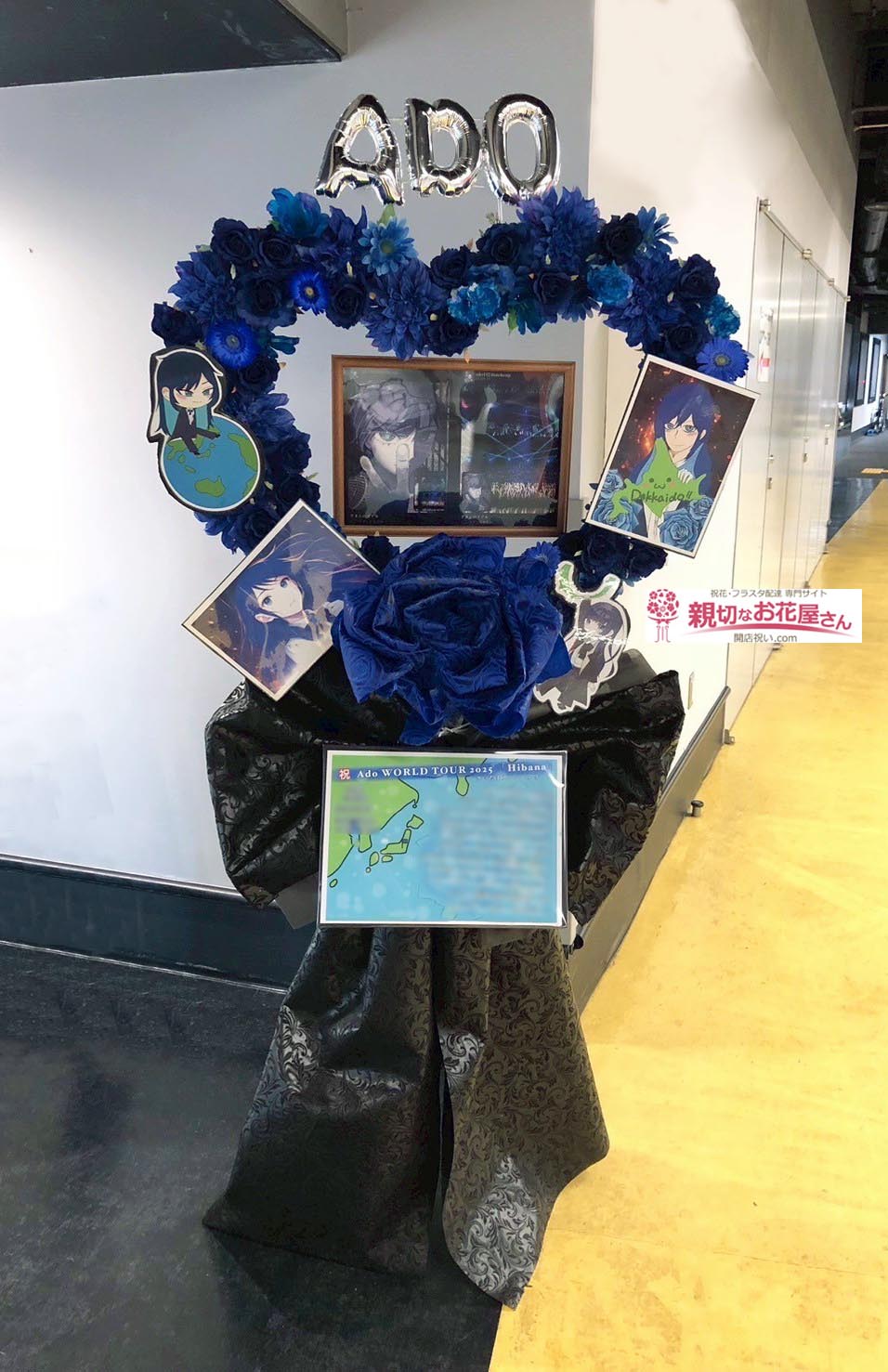 - 【生花×造花】埼玉県さいたま市中央区 さいたまスーパーアリーナ『Ado WORLD TOUR 2025「Hibana」』Ado 様に公演祝い花(フラスタ)をお届けしました。青いバラを使いハートリース型のフラスタをお作りしました。ジャイアントペーパーフラワーやイラストパネルなど装飾の華やかさが際立つフラスタとなっております。埼玉県さいたま市中央区のお祝い花(アレンジメント花・スタンド花・フラスタ・胡蝶蘭・観葉植物)の手配は親切なお花屋さん(開店祝い.com)にお任せください!