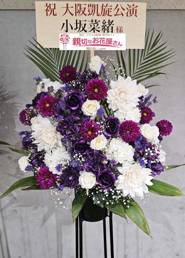 - 【生花×造花】大阪府大阪市中央区 大阪城ホール『日向坂46「 ARENA TOUR 2025「MONSTER GROOVE」大阪公演』小坂菜緒 様に公演祝い花(スタンド花)をお届けしました。白と紫の花材を使い、清楚さと上品さを併せ持った色使いで華やかなスタンド花をお作りしました。大阪府大阪市中央区のお祝い花(アレンジメント花・スタンド花・フラスタ・胡蝶蘭・観葉植物)の手配は親切なお花屋さん(開店祝い.com)にお任せください!