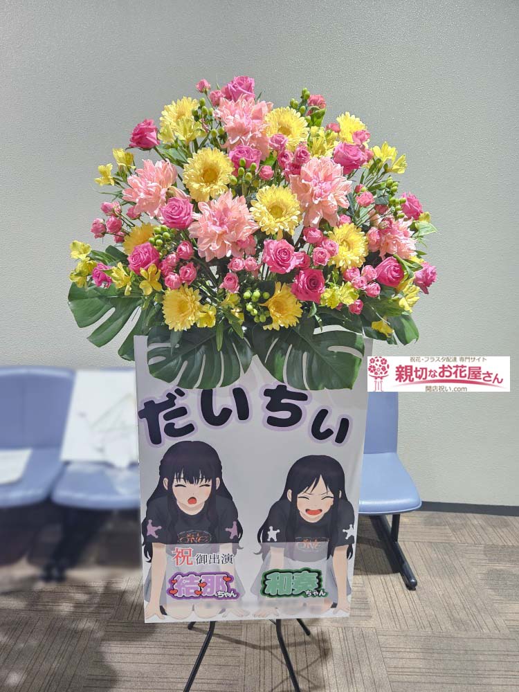 【生花×造花】大阪府大阪市中央区 大阪城ホール 『ラブライブ!スーパースター!! Liella! 6th LoveLive! Tour ~Let's be ONE~』結那様 和奏様に出演祝い花(フラスタ)をお届けしました。黄色とピンクの色味でおまとめしました。愛らしいイラストパネルとボリュームある花々を組み合わせ華やかなフラスタをお作りしました。大阪府大阪市中央区のお祝い花(アレンジメント花・スタンド花・フラスタ・胡蝶蘭・観葉植物)の手配は親切なお花屋さん(開店祝い.com)にお任せください!