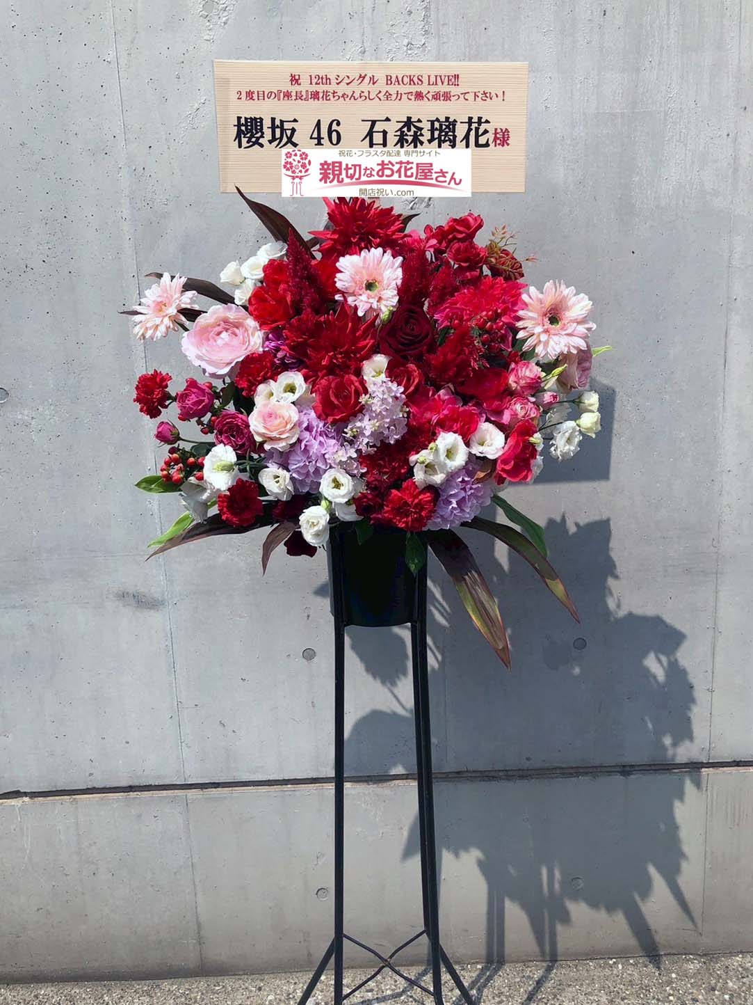 - 【生花×造花】千葉県千葉市美浜区 幕張メッセ『櫻坂46「12th Single BACKS LIVE!!」』石森瑠花 様に公演祝い花(スタンド花)をお届けしました。赤とピンクの明るく鮮やかな色合いでおまとめしました。千葉県千葉市美浜区のお祝い花(アレンジメント花・スタンド花・フラスタ・胡蝶蘭・観葉植物)の手配は親切なお花屋さん(開店祝い.com)にお任せください!