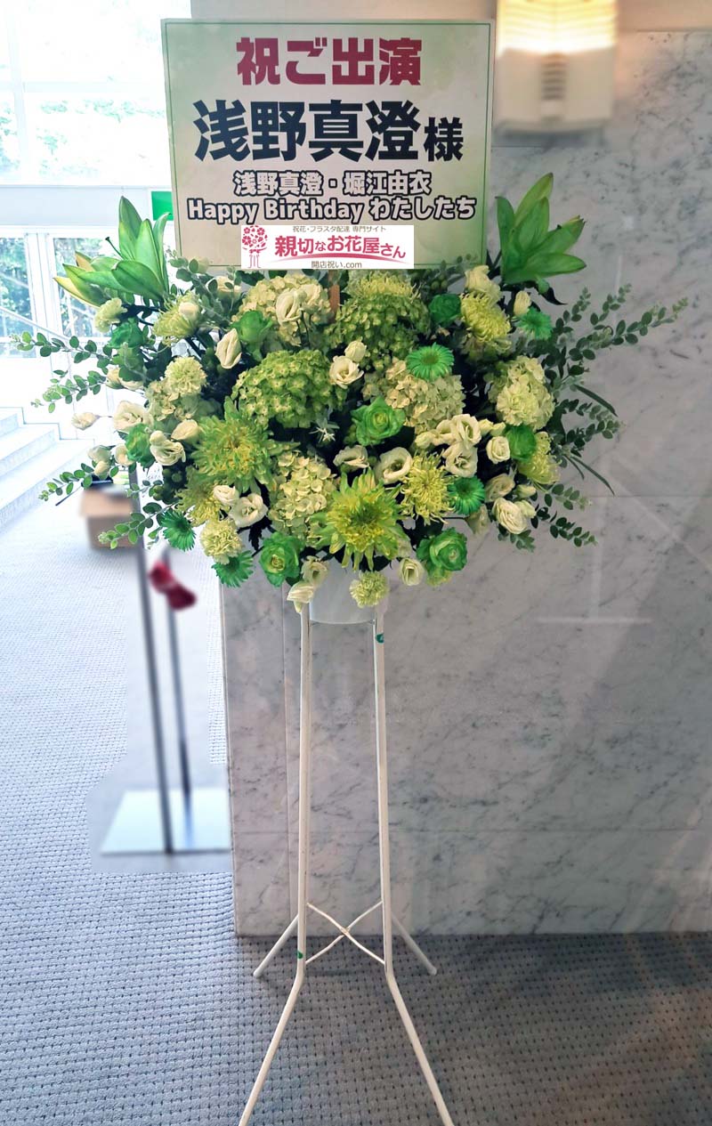 『生花×造花』千葉県松戸市 森のホール21『TALES OF LEGENDIA ~20th Anniversary party~』浅野真澄 様に出演祝い花(フラスタ)をお届けしました。リラックス効果を感じるグリーン系の爽やかなイメージのフラスタをお作りしました。千葉県松戸市のお祝い花(アレンジメント花・スタンド花・フラスタ・胡蝶蘭・観葉植物)の手配は親切なお花屋さん(開店祝い.com)にお任せください!
