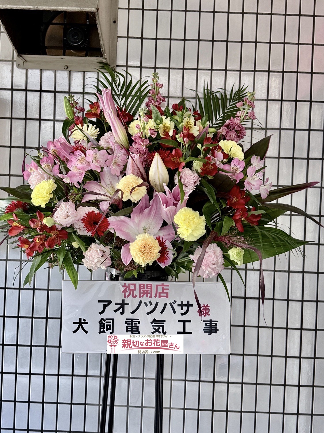 愛知県名古屋市北区 アオノツバサ 様に開店祝い花(スタンド花)をお届けしました。大輪のピンクのユリを中央に挿しカーネーションやアルストロメリアなどの花々を使って開店のお祝いにふさわしい華やかなスタンド花をお作りしました。愛知県名古屋市北区のお祝い花(アレンジメント花・スタンド花・フラスタ・胡蝶蘭・観葉植物)の手配は親切なお花屋さん(開店祝い.com)にお任せください!