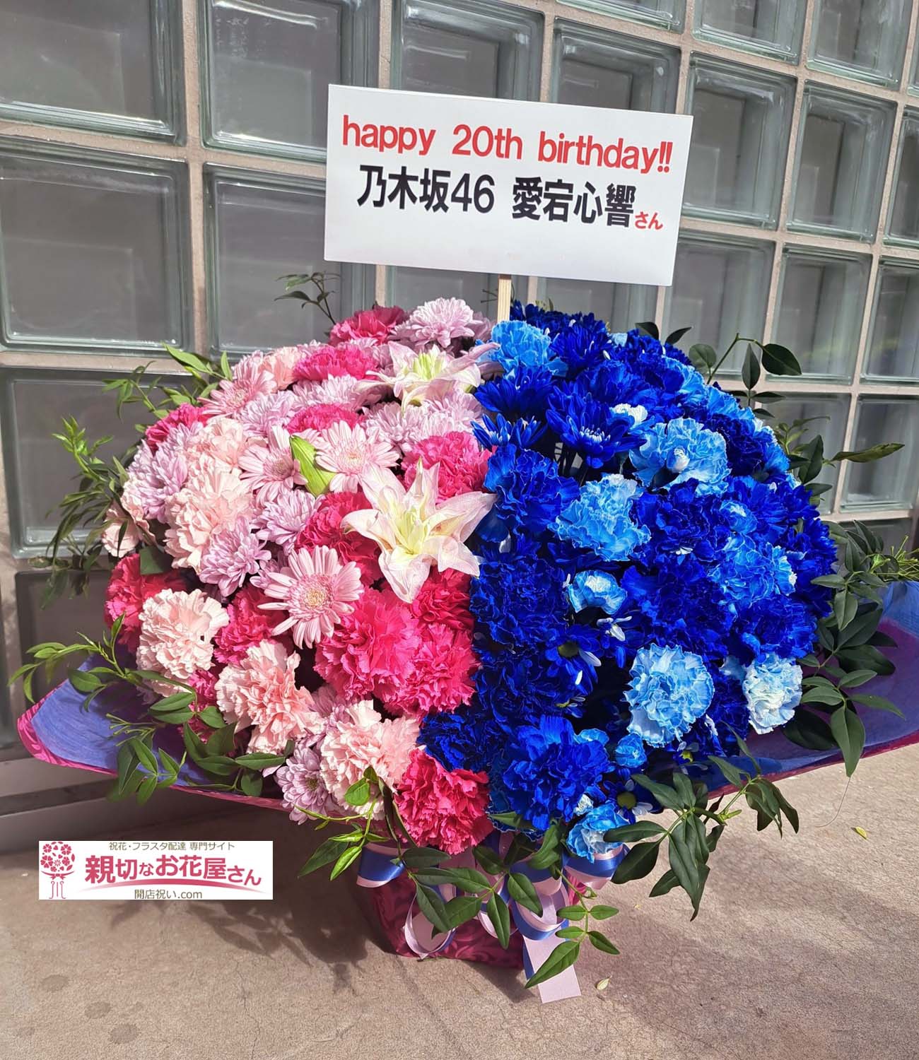 『乃木坂46 39thシングル「Same numbers」発売記念「リアルミート&グリート」』 幕張メッセ(千葉市美浜区)愛宕心響 様に祝花(アレンジ花)をお届けしました。ピンクと青の花材を左右セパレート分けにしておまとめしました。たくさんのカーネーションの美しさがひときわ目を引くアレンジ花をお作りしました。千葉市美浜区のお祝い花(アレンジメント花・スタンド花・フラスタ・胡蝶蘭・観葉植物)の手配は親切なお花屋さん(開店祝い.com)にお任せください!