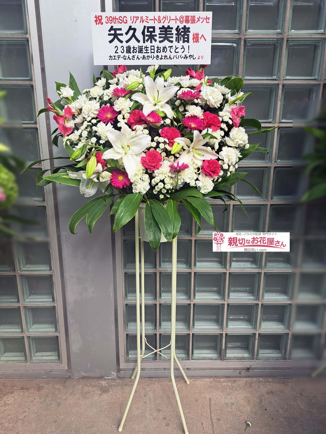 『乃木坂46 39thシングル「Same numbers」発売記念「リアルミート&グリート」』 幕張メッセ(千葉市美浜区)矢久保美緒 様に祝花(スタンド花)をお届けしました。白い花材の中にビビッドなピンクのガーベラを散りばめて華やかなスタンド花をお作りしました。千葉市美浜区のお祝い花(アレンジメント花・スタンド花・フラスタ・胡蝶蘭・観葉植物)の手配は親切なお花屋さん(開店祝い.com)にお任せください!