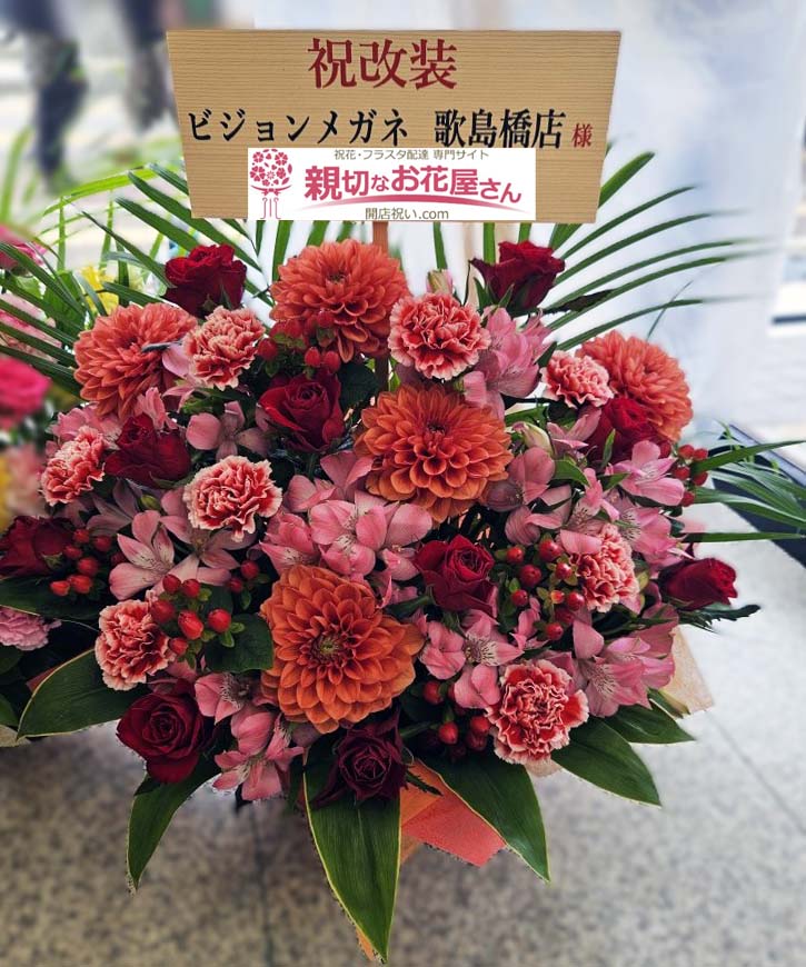 - 大阪市西淀川区 ビジョンメガネ 歌島橋店 様にリニュアルオープン祝い花(アレンジ花)をお届けしました。ピンク・オレンジ・赤の色味で華やかさが際立つアレンジ花をお作りしました。大阪市西淀川区のお祝い花(アレンジメント花・スタンド花・フラスタ・胡蝶蘭・観葉植物)の手配は親切なお花屋さん(開店祝い.com)にお任せください!