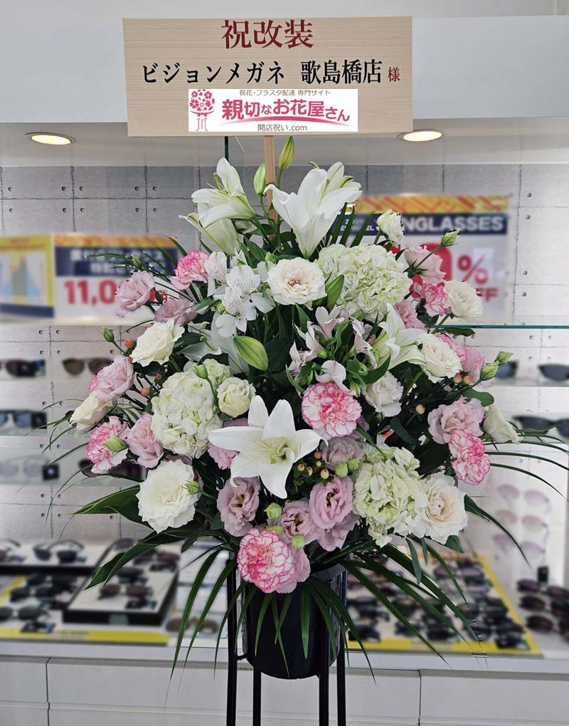 大阪市西淀川区 ビジョンメガネ 歌島橋店 様にリニュアルオープン祝い花(スタンド花)をお届けしました。薄ピンクと白の組み合わせでおまとめしました。ユリの華やかさが際立ちます。大阪市西淀川区のお祝い花(アレンジメント花・スタンド花・フラスタ・胡蝶蘭・観葉植物)の手配は親切なお花屋さん(開店祝い.com)にお任せください!