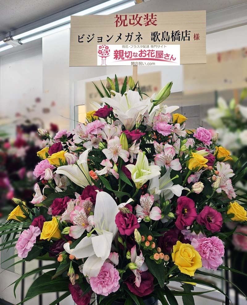 - 大阪市西淀川区 ビジョンメガネ 歌島橋店 様にリニュアルオープン祝い花(スタンド花)をお届けしました。黄色いバラ、大輪の白いユリをはじめ多種類の花々を使って華やかなスタンド花をお作りしました。大阪市西淀川区のお祝い花(アレンジメント花・スタンド花・フラスタ・胡蝶蘭・観葉植物)の手配は親切なお花屋さん(開店祝い.com)にお任せください!