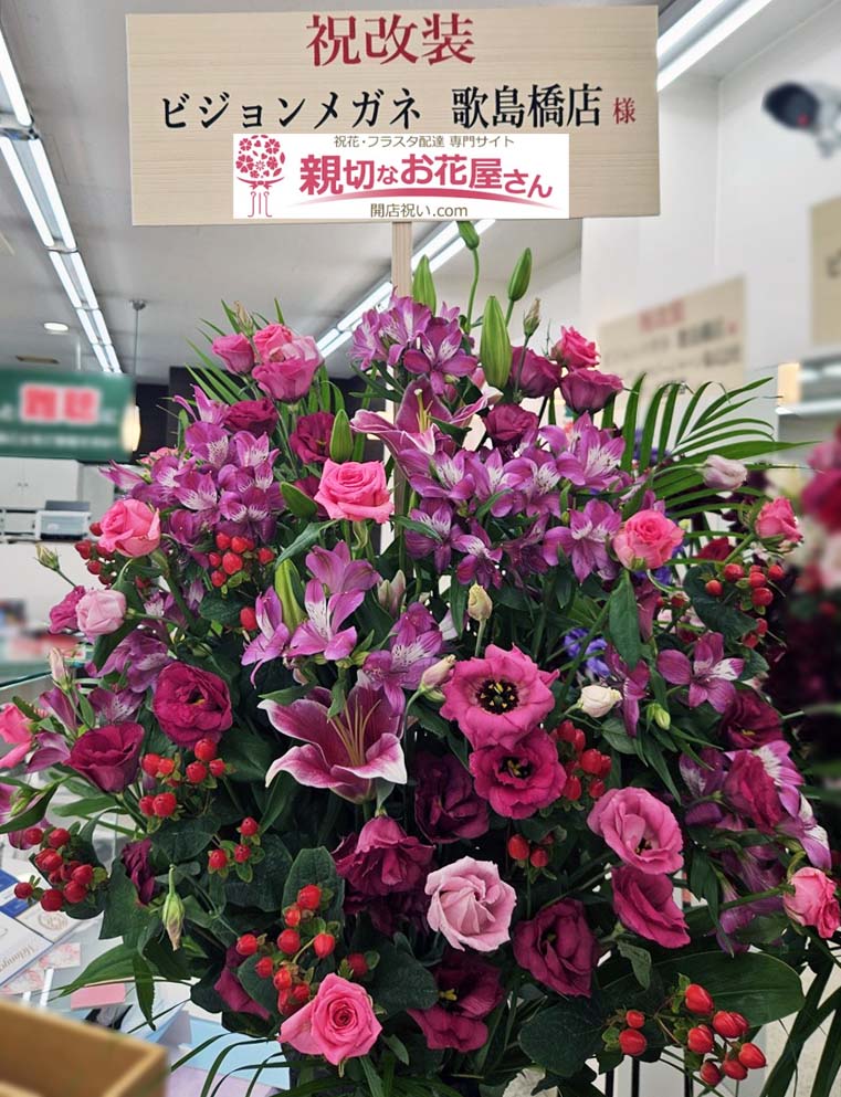 - 大阪市西淀川区 ビジョンメガネ 歌島橋店 様にリニュアルオープン祝い花(スタンド花)をお届けしました。アルストロメリアをはじめ紫系の花材を集め華やかにおまとめしました。大阪市西淀川区のお祝い花(アレンジメント花・スタンド花・フラスタ・胡蝶蘭・観葉植物)の手配は親切なお花屋さん(開店祝い.com)にお任せください!