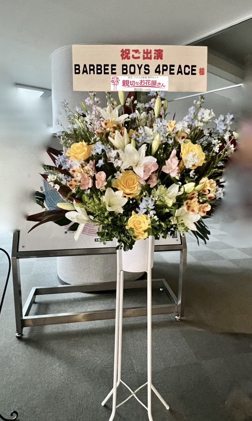 - 『カノフェス2026』仙台サンプラザホール(仙台市宮城野区)BARBEE BOYS 4PEACE 様に出演祝い花(スタンド花)をお届けしました。ユリなどの大ぶりの花材と愛らしい小ぶりの花材を組み合わせ華やかなスタンド花をお作りしました。仙台市宮城野区のお祝い花(アレンジメント花・スタンド花・フラスタ・胡蝶蘭・観葉植物)の手配は親切なお花屋さん(開店祝い.com)にお任せください!