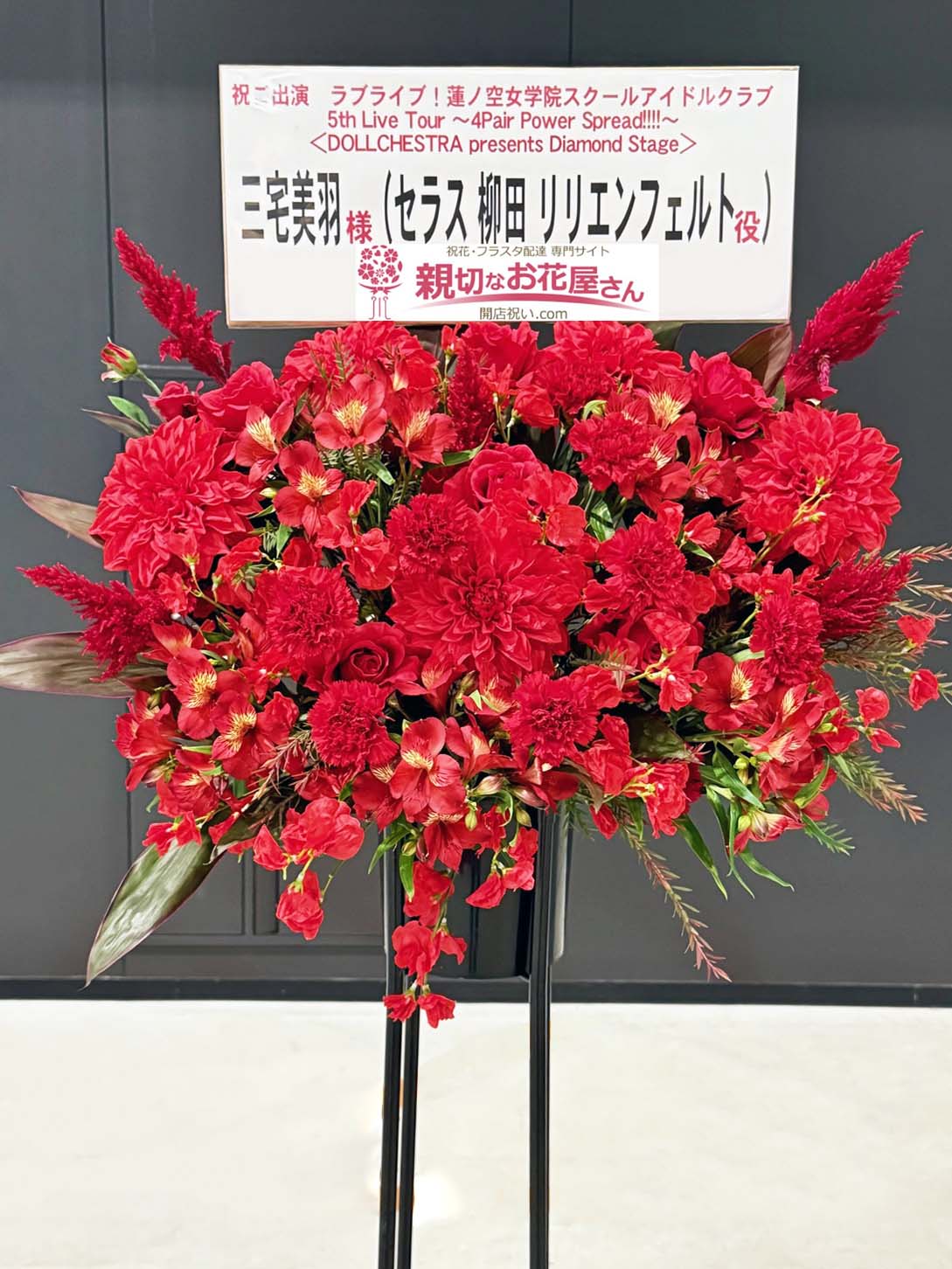 - 『ラブライブ!蓮ノ空女学院スクールアイドルクラブ 5th Live Tour ~4Pair Power Spread!!!!~』AICHI SKY EXPO(常滑市)三宅美羽様(セラス 柳田 リリエンフェルト役)に出演祝い花(スタンド花)【生花×造花】をお届けしました。鮮やかな赤色を意味するメンバーカラーのライズスカーレットの色味で華やかなスタンド花をお作りしました。常滑市のお祝い花(アレンジメント花・スタンド花・フラスタ・胡蝶蘭・観葉植物)の手配は親切なお花屋さん(開店祝い.com)にお任せください!
