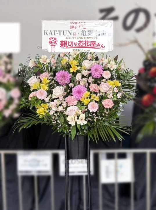 - 『Break the KAT-TUN』ZOZOマリンスタジアム(千葉市美浜区)KAT-TUN 様 亀梨和也 様に公演祝い花(スタンド花)をお届けしました。ダリアやバラなど華やかな花材をふんだんに使い高級感あふれるスタンド花をお作りしました。千葉市美浜区のお祝い花(アレンジメント花・スタンド花・フラスタ・胡蝶蘭・観葉植物)の手配は親切なお花屋さん(開店祝い.com)にお任せください!