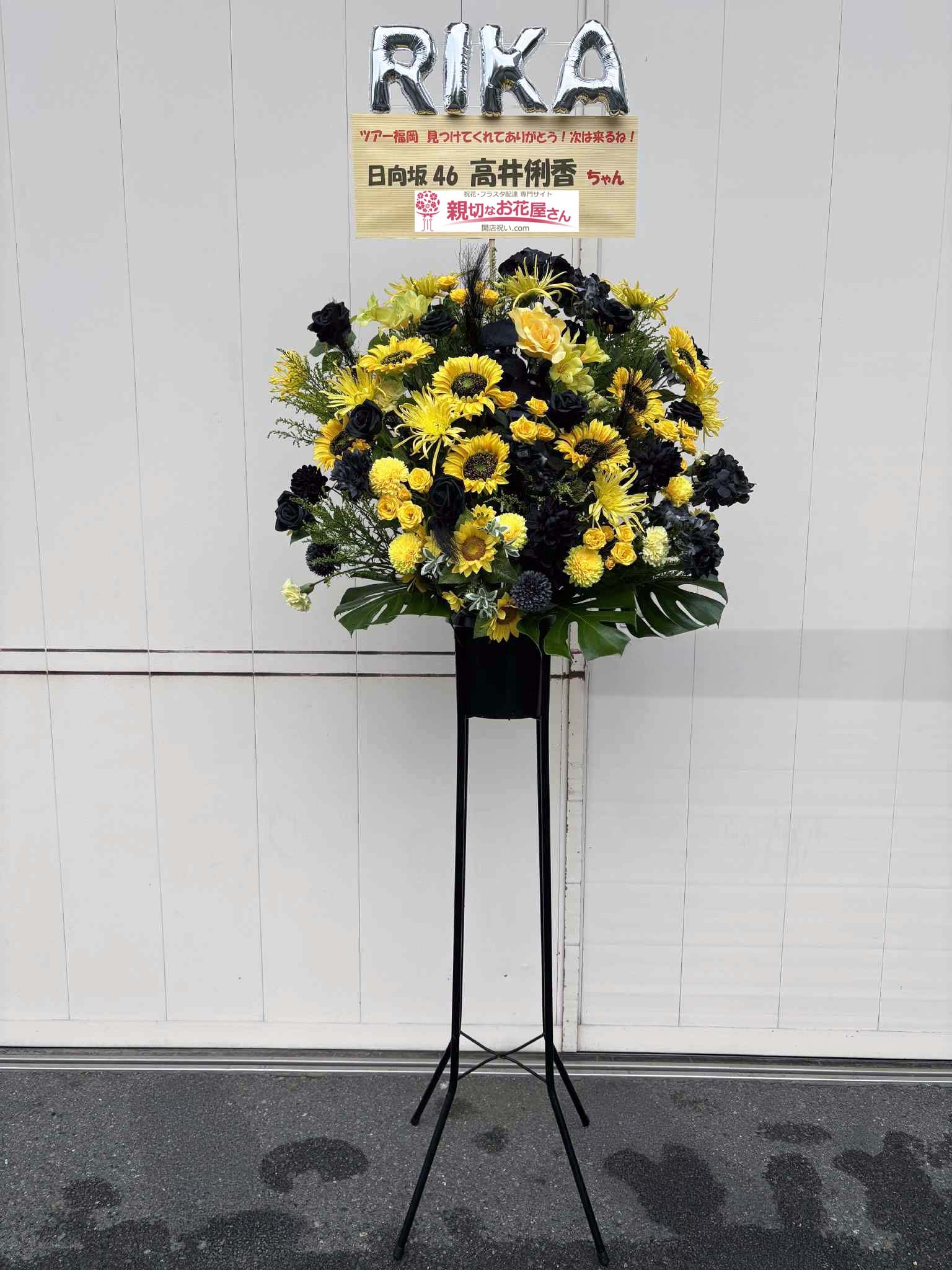 - 『日向坂46 15thシングル『お願いバッハ!』発売記念「リアルミート&グリート」「リアルサイン会」』京都パルスプラザ(京都市伏見区)高井俐香 様に祝花(フラスタ)【生花×造花】をお届けしました。黒と黄色の色合いでアクティブでおしゃれなイメージのフラスタをお作りしました。京都市伏見区のお祝い花(アレンジメント花・スタンド花・フラスタ・胡蝶蘭・観葉植物)の手配は親切なお花屋さん(開店祝い.com)にお任せください!