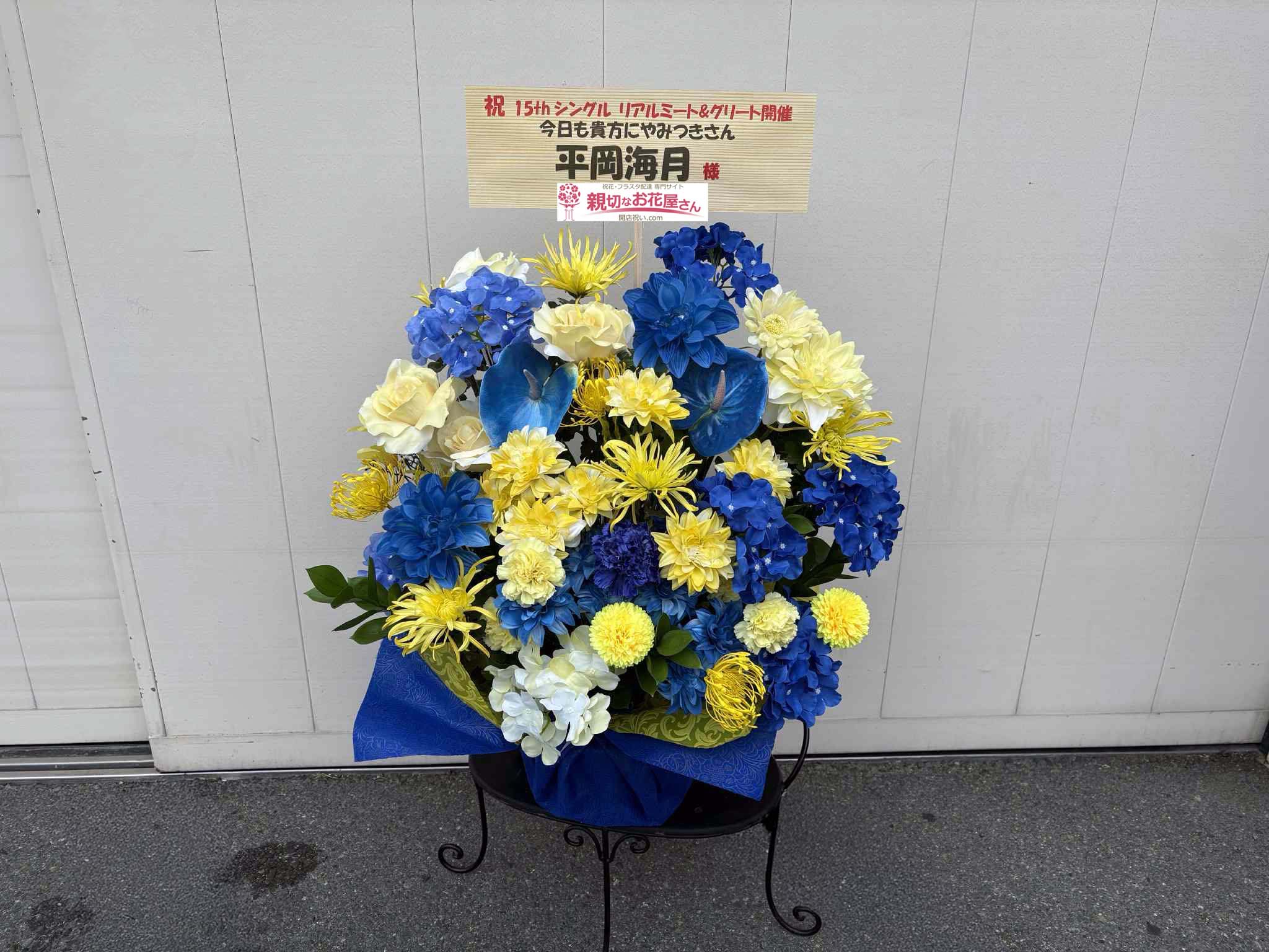- 『日向坂46 15thシングル『お願いバッハ!』発売記念「リアルミート&グリート」「リアルサイン会」』京都パルスプラザ(京都市伏見区)平岡海月 様に祝花(アレンジ花)【生花×造花】をお届けしました。青と黄色の花材でコントラストが美しいアレンジ花をお作りしました。京都市伏見区のお祝い花(アレンジメント花・スタンド花・フラスタ・胡蝶蘭・観葉植物)の手配は親切なお花屋さん(開店祝い.com)にお任せください!