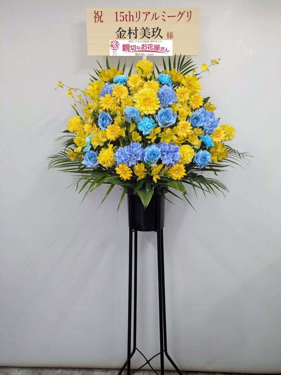 - 『日向坂46 15thシングル『お願いバッハ!』発売記念「リアルミート&グリート」「リアルサイン会」』京都パルスプラザ(京都市伏見区)金村美玖 様に祝花(スタンド花)【生花×造花】をお届けしました。黄色と水色の二色の花材をミックスして華やかなスタンド花をお作りしました。互いを引き立てるコントラストがおしゃれな雰囲気です。京都市伏見区のお祝い花(アレンジメント花・スタンド花・フラスタ・胡蝶蘭・観葉植物)の手配は親切なお花屋さん(開店祝い.com)にお任せください!