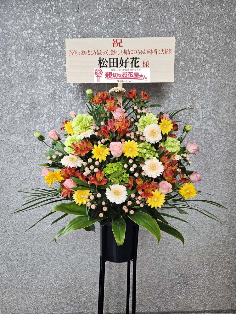 - 『日向坂46 15thシングル『お願いバッハ!』発売記念「リアルミート&グリート」「リアルサイン会」』京都パルスプラザ(京都市伏見区)松田好花 様に祝花(スタンド花)【生花×造花】をお届けしました。ピンクや黄緑など優しくキュートな色合いの花材を使い愛らしいイメージのスタンド花をお作りしました。京都市伏見区のお祝い花(アレンジメント花・スタンド花・フラスタ・胡蝶蘭・観葉植物)の手配は親切なお花屋さん(開店祝い.com)にお任せください!