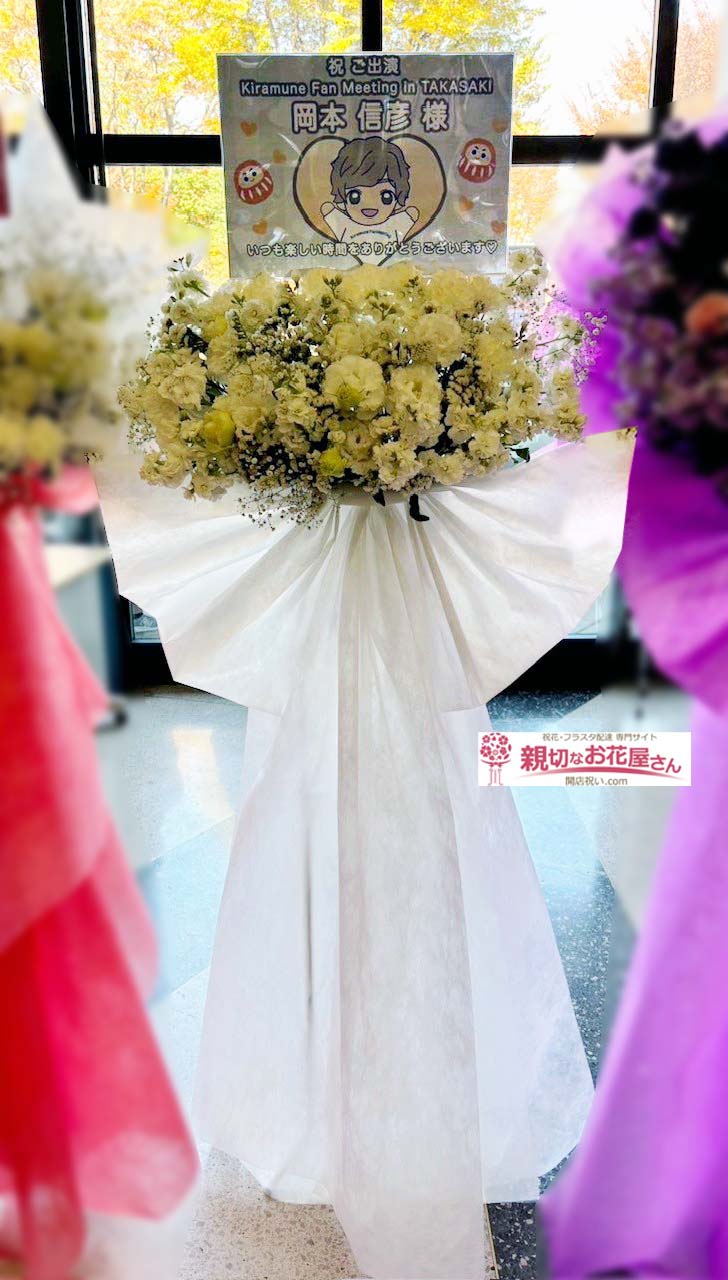 - 『Kiramune Fan Meeting in TAKASAKI』群馬音楽センター(高崎市)岡本信彦 様に出演祝い花(フラスタ)をお届けしました。花材とロングリボンともに白一色でおまとめしました。輝くような白さが際立ちます。高崎市のお祝い花(アレンジメント花・スタンド花・フラスタ・胡蝶蘭・観葉植物)の手配は親切なお花屋さん(開店祝い.com)にお任せください!