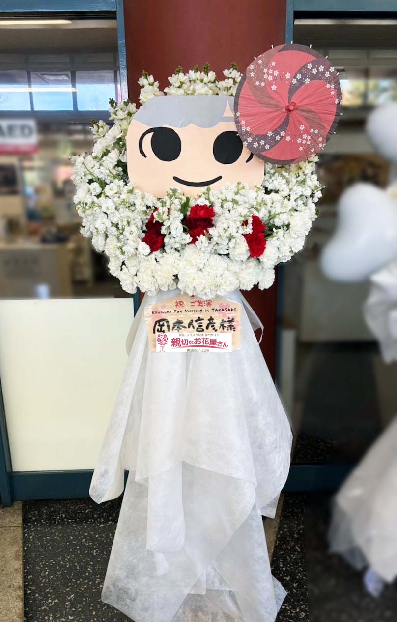 - 『Kiramune Fan Meeting in TAKASAKI』群馬音楽センター(高崎市)岡本信彦 様に出演祝い花(フラスタ)をお届けしました。白い花材を使いダルマ型の丸いフォルムでお作りしました。可愛らしい自作プレートや和傘などの装飾で華やかなフラスタとなっております。高崎市のお祝い花(アレンジメント花・スタンド花・フラスタ・胡蝶蘭・観葉植物)の手配は親切なお花屋さん(開店祝い.com)にお任せください!