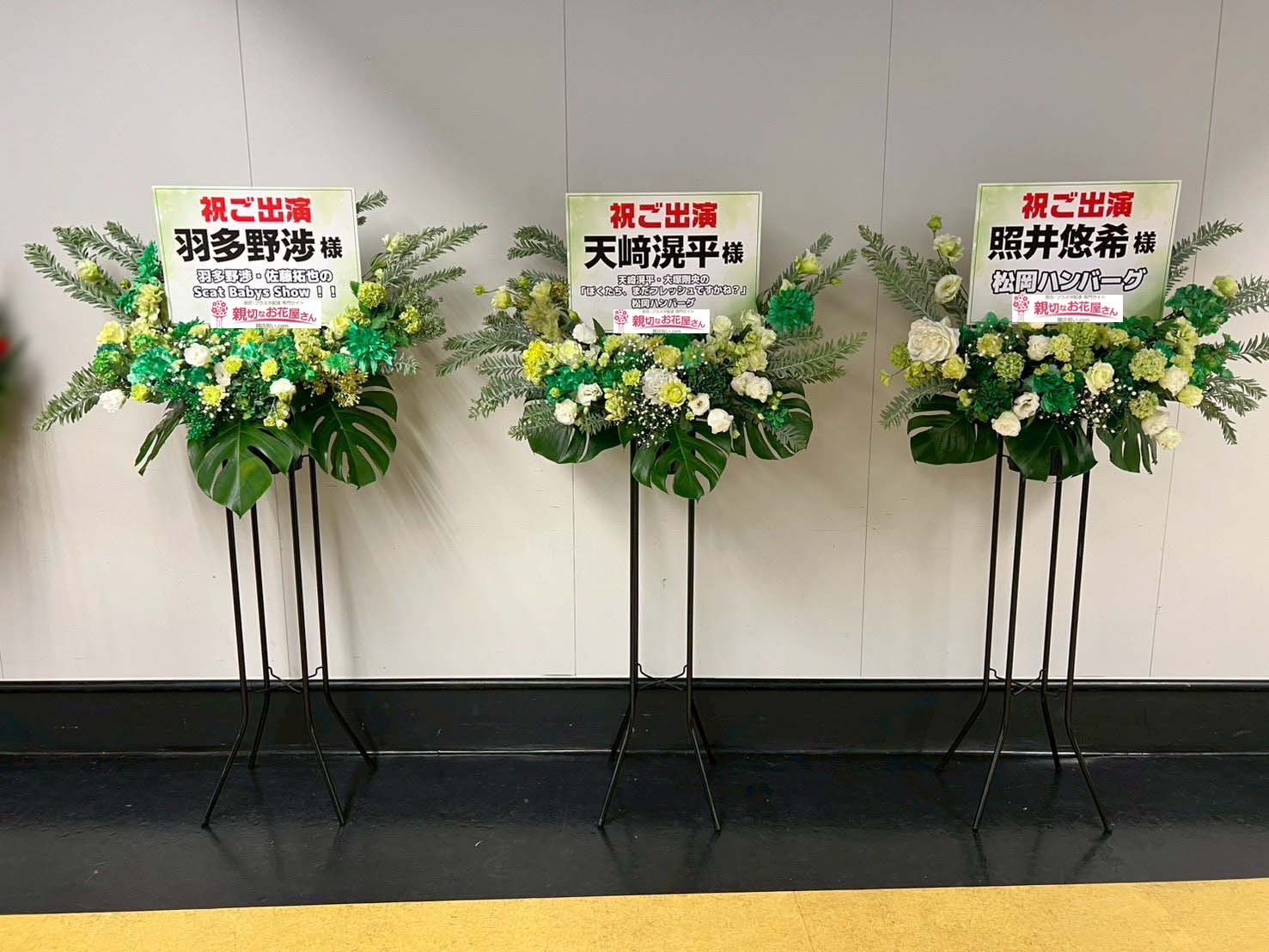 - 『あんさんぶるスターズ!!「Ensemble Stars!! Cast Live Starry Symphony -Superbloom-」』 さいたまスーパーアリーナ(さいたま市中央区)羽多野渉様 天﨑滉平様 照井悠希様に出演祝い花(フラスタ・3基)【生花×造花】をお届けしました。グリーン系の爽やかなイメージのフラスタをお作りしました。さいたま市中央区のお祝い花(アレンジメント花・スタンド花・フラスタ・胡蝶蘭・観葉植物)の手配は親切なお花屋さん(開店祝い.com)にお任せください!