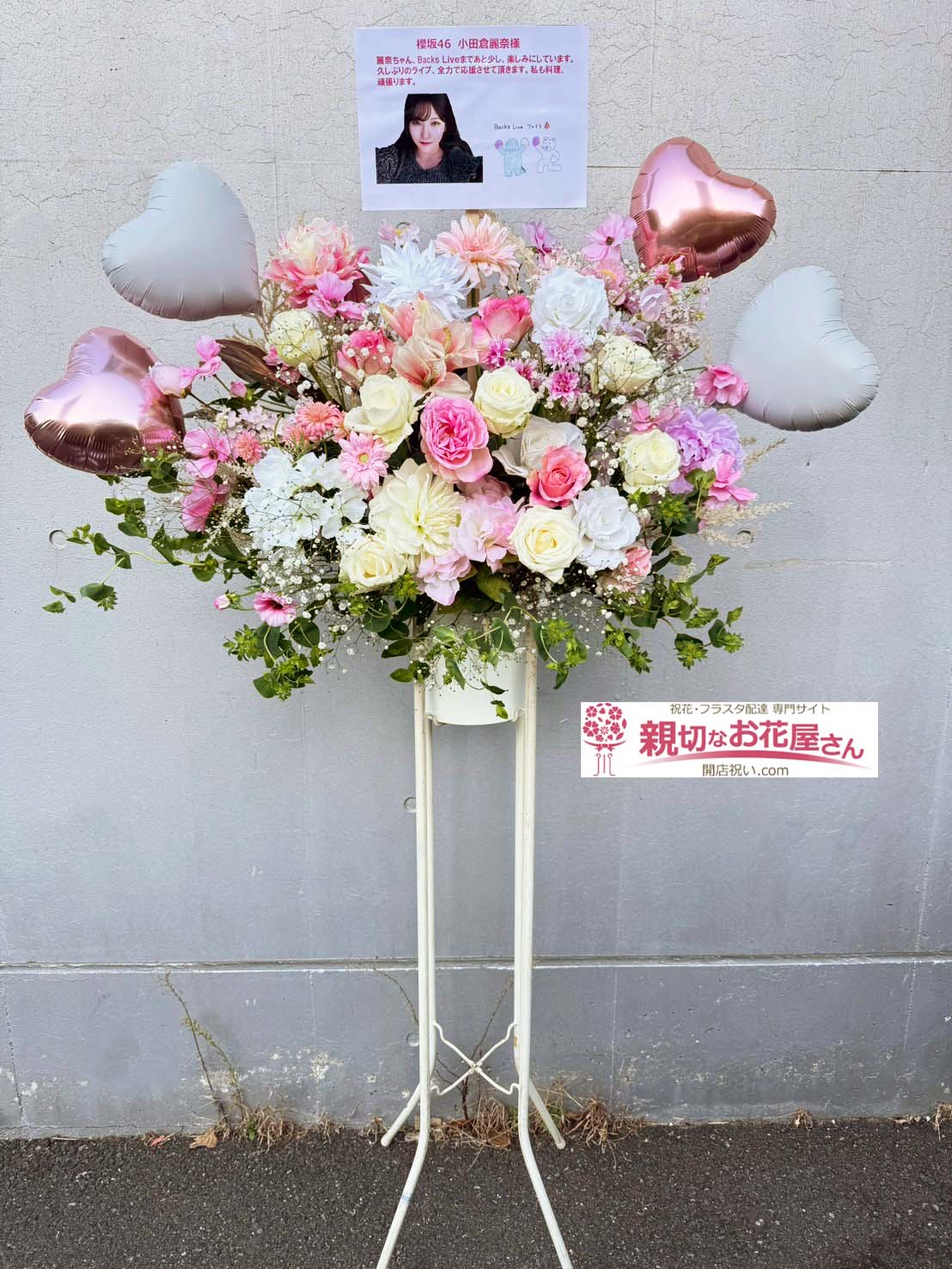 - 『櫻坂46「リアルミート&グリート+リアルサイン会」』幕張メッセ(千葉市美浜区)小田倉麗奈 様に祝花(フラスタ)【生花×造花】をお届けしました。ハート型バルーンの装飾がラブリーなイメージのフラスタをお作りしました。千葉市美浜区のお祝い花(アレンジメント花・スタンド花・フラスタ・胡蝶蘭・観葉植物)の手配は親切なお花屋さん(開店祝い.com)にお任せください!