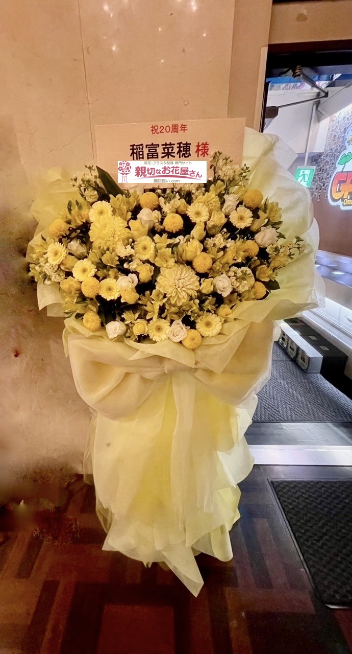 - 『稲富菜穂 20周年記念イベント東京編~COSMETIC ROBOT 一夜限りの再集結~』表参道GROUND(渋谷区神宮前)稲富菜穂 様 に祝花(フラスタ)【生花×造花】をお届けしました。全体を黄色でおまとめしました。花々を花束風に囲んでエレガントな雰囲気でおまとめしたフラスタとなっております。渋谷区神宮前のお祝い花(アレンジメント花・スタンド花・フラスタ・胡蝶蘭・観葉植物)の手配は親切なお花屋さん(開店祝い.com)にお任せください!