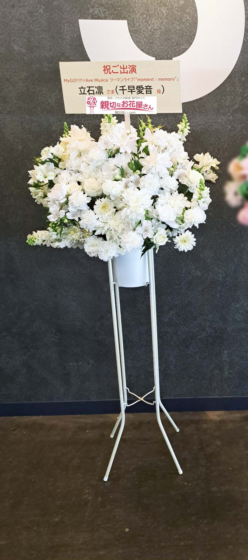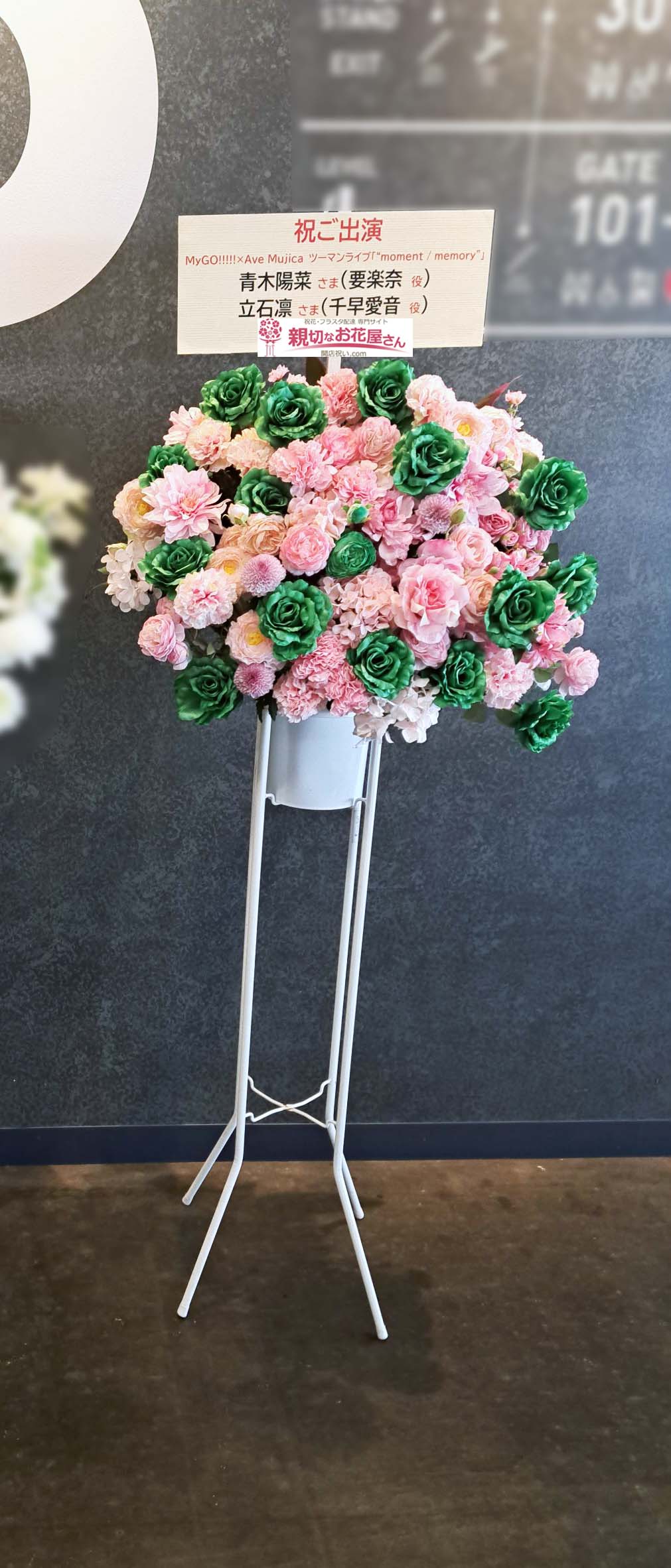 - 『MyGO!!!!! x Ave Mujica ツーマンライブ「“moment / memory”」』Kアリーナ横浜(横浜市西区)立石凛 様(千早愛音 役)青木陽菜 様(要楽奈 役) に出演祝い花(スタンド花・まとめて一括・2基)【生花×造花】をお届けしました。立石様のスタンド花は白一色で、青木様と立石様連名のスタンド花はピンクとグリーンの二色使いでそれぞれお作りしました。横浜市西区のお祝い花(アレンジメント花・スタンド花・フラスタ・胡蝶蘭・観葉植物)の手配は親切なお花屋さん(開店祝い.com)にお任せください!