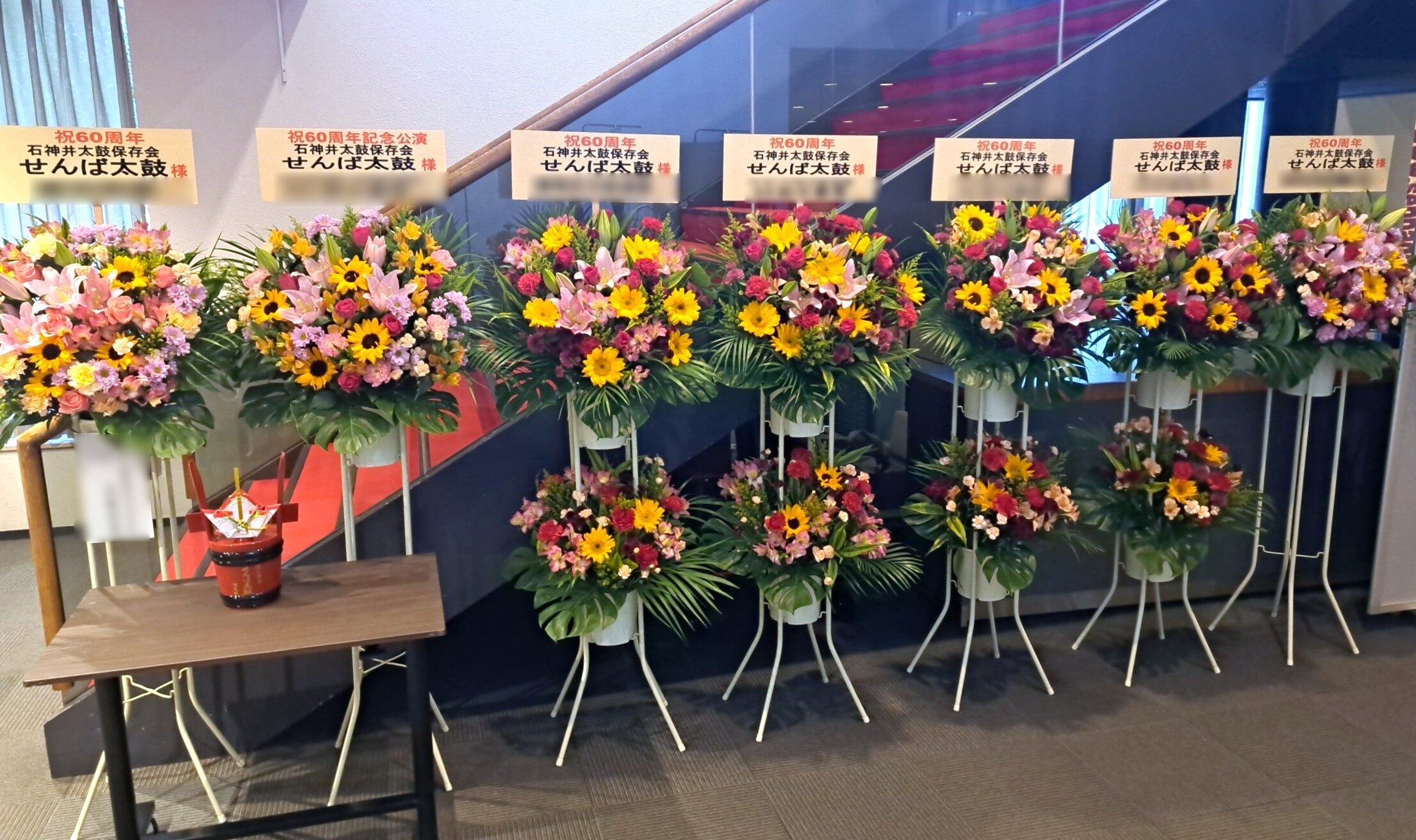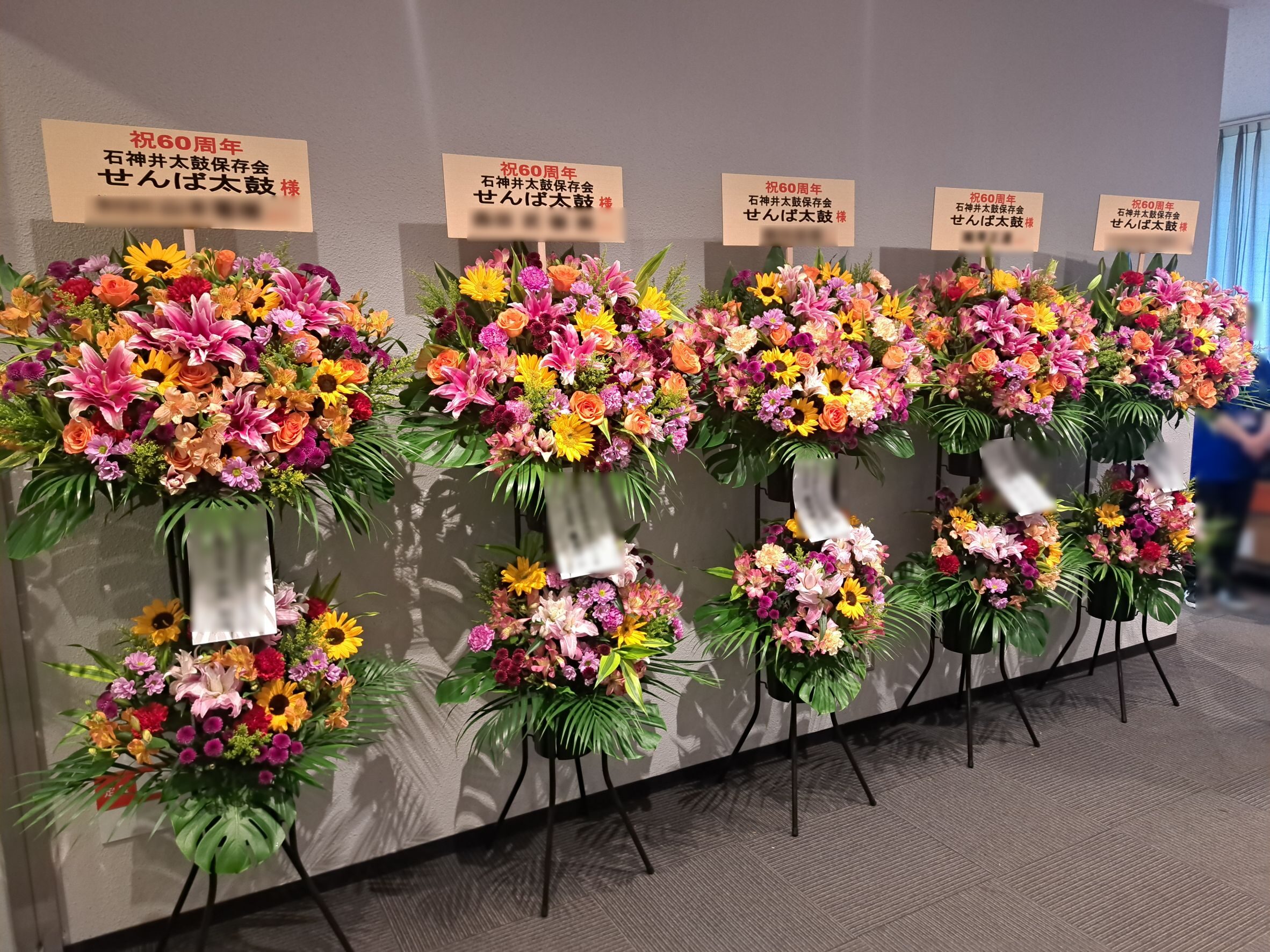 練馬文化センター 小ホールで開催されました『石神井太鼓保存会せんば太鼓60周年記念公演』様にスタンド花 12基をお届けしました。会場ロビーいっぱいに華やかなスタンド花がずらり並び、関係者様、来場者様にも喜んでいただきました。