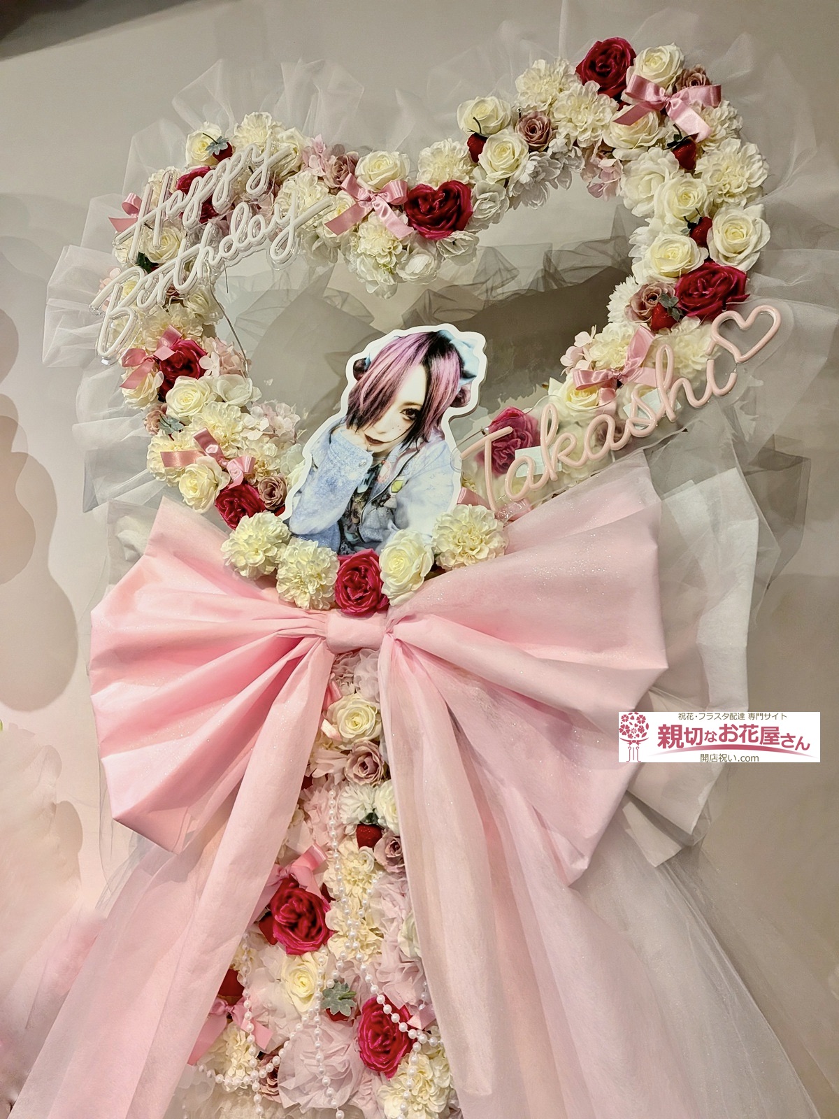 - 『太嘉志BIRTHDAY ONE MAN 「マジで愛しの太 嘉志バースデー2026」』NAGANO CLUB JUNK BOX(長野市)太嘉志 様に生誕祭祝い花(フラスタ)【生花×造花】をお届けしました。白い花材でハート型のフラスタをお作りしました。電飾やパールをはじめとした様々な装飾の華やかさが目を引くフラスタとなっております。長野市のお祝い花(アレンジメント花・スタンド花・フラスタ・胡蝶蘭・観葉植物)の手配は親切なお花屋さん(開店祝い.com)にお任せください!